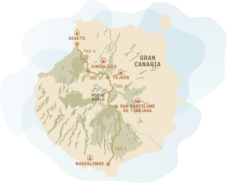 Die vier Etappen summieren sich auf 74 km und rund 3.380 Höhenmeter bergauf. Du wanderst täglich mehrere Stunden – von den Dünen in Maspalomas bis auf über 1.800 Meter. Gran Canaria ist eine bergige Insel: du bist fast immer am Steigen oder Fallen.